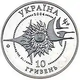 На аверсе: в круге из бусин — изображение малого государственного герба Украины в окружении аллегорической композиции из Солнца, стилизованного крыла, птиц и звёзд. Логотип Монетного двора НБУ, надписи «УКРАЇНА 2004 10 ГРИВЕНЬ», обозначение металла, его пробы и веса чистого серебра «Ag 925 31,1». На реверсе: самолёт Ан-140, логотип «АН», надписи «ЛІТАКИ УКРАЇНИ АН-140 AN-140». |