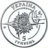 На аверсе: в круге из бусин — изображение малого государственного герба Украины в окружении аллегорической композиции из Солнца, стилизованного крыла, птиц и звёзд. Логотип Монетного двора НБУ, надписи «УКРАЇНА 2002 5 ГРИВЕНЬ». На реверсе: самолёт Ан-225 «Мрия» над взлётно-посадочной полосой, логотип «АН», надписи «ЛІТАКИ УКРАЇНИ АН-225 `МРІЯ`». |