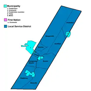 Часть деревни Минто находится на территории графства Санбери, но для целей статистической службы Канады считается частью графства Куинс. Аналогично, Часть города Фредериктон находится на территории графства, но считается частью графства Йорк.