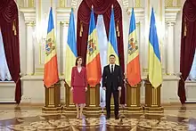12 января 2021 совершила свой первый зарубежный визит в качестве президента, посетив Украину[67]. В аэропорту «Борисполь» приветствовала почётный караул словами «Слава Украине»[68]. На переговорах с президентом Украины Владимиром Зеленским, премьер-министром Денисом Шмыгалем и председателем Верховной рады Дмитрием Разумковым обсуждались вопросы взаимодействия двух стран в сферах евроинтеграции, торговли, энергобезопасности; были достигнуты договорённости о строительстве новой дороги Кишинёв—Сороки—Ямполь—Киев с мостом через Днестр в обход Приднестровья с севера[69][70]; дальнейшей реинтеграции Приднестровья в состав Молдавии, совместного контроля на молдавско-украинской границе и борьбы с контрабандой; а так же о строительстве новых украинских ГЭС в рамках Днестровского каскада ГЭС[71][72]. В перспективе решение о строительстве новых ГЭС может лишить Молдавию значительной части питьевой воды и обернуться экологической катастрофой для страны[73][74][75]. В ходе визита почтила память погибших украинцев у Памятника Вечной Славы на могиле Неизвестного солдата и в Национальном музее Голодомора-геноцида[76].