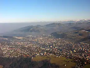 Средняя температура воздуха в городе составляет 7,4 °C, средняя температура в июле 16 °C, в январе −1,8 °.С Среднее количество осадков составляет 1250 мм, в год, причем большинство осадков выпадает летом.[3]