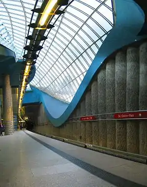 Однопролётная станция мелкого заложения, планировалась и оформлялась архитектурным бюро Херман + Этль (нем. Hermann + Öttl)[2]. В северной части платформы на юго-западной боковой стене пассажирам представляется неповторимый вид через огромное раковинообразное окно в парк. Естественно оставленные стены контрастируют с синей рамой стеклянного купола и с табличками красного цвета примерно на высоте человеческого роста. Потолок над южной частью платформы оснащен отражающими алюминиевыми панелями с двумя рядами ламп. На полу в светлых гранитных плитах встроены цветные круглые инкрустации, которые как огромные конфетти рассыпаны по платформе. Имеет два выхода по обоим концам платформы[3]. В северной части платформы расположены два лифта, так как поблизости учреждение для инвалидов.
