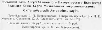 «Санкт-Петербургский автомобиль-клуб» состоял под Августейшим покровительством Его Императорского Высочества Великого князя Сергея Михайловича. Деятельность «Санкт-Петербургского автомобиль-клуба» благотворно сказывалась на развитии автомобилизма и автомотоспорта по всей России. Проводилось большое число автопробегов и рекордных заездов на верстовых гонках. Активное участие клуб принял в организации и проведении первых в России международных автогонок и международных автомобильных выставок.