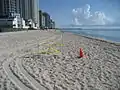 Длинный и узкий пляж тянется вдоль всего атлантического побережья города. Конусом и лентой обозначена кладка яиц морской черепахи.