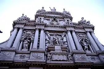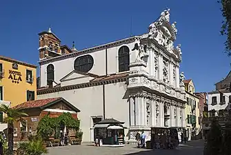 Отличительной чертой этой церкви является фасад. Его создал Джузеппе Сарди в честь Антонио Барбаро и его семьи, и вместо обычных фигур святых на нём появились очертания городов Задар, Кандия, Падуя, Рим, Корфу и Сплит, которые сыграли не последнюю роль для этого семейства. В нишах между колоннами можно видеть статуи братьев Барбаро.