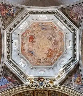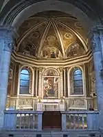 Алтарную картину «Ассунта» должен был написать сам Рафаэль, но вышло так, что после смерти Рафаэля в 1520 году его ученик Себастьяно дель Пьомбо начал писать «Рождество Богоматери» в 1530 году, а завершил алтарь Франческо Сальвиати. До конца XVI века внутри храма находились картины написанные Рафаэлем специально для этой церкви портрет Папы Юлия II и «Мадонна с вуалью». Росписи в барабане между окнами и в парусах выполнил Ф. Сальвиати[7]. По рисункам Рафаэля созданы две из четырёх скульптур в нишах, пророков: Илии, живущего милостью Бога в пустыне, и обнажённого Ионы, освобожденного из чрева кита, как символ воскресения из мертвых. В мраморе их выполнил Лоренцо Лотти из Флоренции по прозванию Лоренцетто.