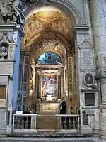 В капелле семьи Черази (слева от главного алтаря) находятся две картины Караваджо: Обращение Савла и Распятие Св. Петра (1601). Над алтарём — картина Аннибале Карраччи «Вознесение Мадонны».