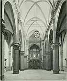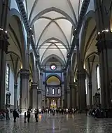 Собор не имеет боковых капелл, поэтому внутреннее пространство храма воспринимается особенно обширным и светлым, в том числе из-за больших круглых окон верхнего яруса центрального нефа. Опорные пилоны собраны из Раскрепованный ордерраскрепованных пилястр. Тёмный тон известняка «пьетра серена» (рietra serena), как и в стрельчатых нервюрах сводов эффектно контрастируют с побелкой стен. Пол выложен полихромной мраморной мозаикой — работа Баччо д’Аньоло, завершённая с 1526 по 1560 год его сыном Джулиано, Франческо да Сангалло и другими мастерами.
