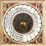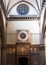 В центре контрфасада выделяются необычные часы, созданные в 1443 году и идущие по сей день. Они являются одними из последних, использующих так называемую «hora italica» (день, разделенный на 24 «часа» различной продолжительности в зависимости от сезона, который начинается при звуке вечерни и используется до восемнадцатого числа). По периметру имеются образы четырёх евангелистов — работа Паоло Уччелло.