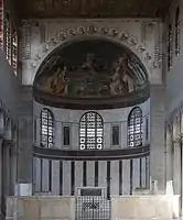 Уникален хор (сhorus cantorum) в восточной части главного нефа с мраморными плитами, украшенными резьбой с раннехристианскими символами, мозаичным полом и канторией, датируемыми IX веком. Раннехристианская мозаика конхи апсиды V века была заменена в 1559 году сходной по иконографии фреской работы маньериста Таддео Цуккаро. Композиция, вероятно, осталась неизменной: Христос в окружении святых на фоне Рая.