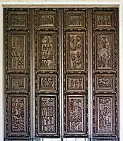 Двери вначале имели 28 резных панелей. Из них 10 утрачены. Сохранилось 18 деревянных панелей, на всех, кроме одной, изображены сцены из Ветхого и Нового Завета. Наиболее известным среди них является одно из самых ранних изображений Распятия Христа (крайняя верхняя панель слева), на которой Христос и два разбойника изображены без крестов: в раннехристианское время крест распятия считался символом позорной, унизительной казни и его изображений старались избегать. Другие композиции также служат предметом тщательного иконографического анализа[11][12].