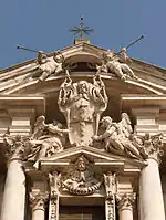 Церковь была построена по распоряжению кардинала Мазарини, его герб и шляпа кардинала, поддерживаемые ангелами, являются центром скульптурной композиции фасада. Среди римлян ходили слухи, что племянница Мазарини, Мария Манчини, фаворитка французского короля Людовика XIV, также представлена на фасаде, в маскароне под центральным окном второго яруса. Изображение мирянки и поддержка герба кардинала ангелами делают скульптурное оформление церкви уникальным — кардинальских гербов больше нет ни на одной церкви Рима[5].