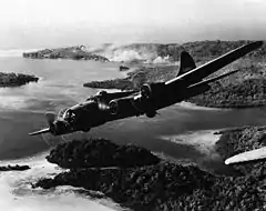 Boeing B-17F 26-й бомбардировочной эскадрильи 11-й бомбардировочной группы над японскими позициями на острове Гизо, Соломоновы Острова. 5 октября 1942 года