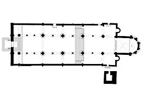 Три нефа базилики ведут к пресбитерию, уровень которого поднят по сравнению с ними. Под пресбитерием расположена крипта в которую ведут две лестницы. Своды храма опираются на массивные колонны, а центральный неф на две поперечные полукруглые арки.