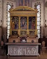 В пресбитерии находится фреска Альтикьеро «Мадонна на престоле со святыми» (1397 год), расписной процессуальный крест середины XIV века и знаменитый триптих Андреа Мантеньи «Мадонна на престоле с ангелами и святыми» (Sacra Conversazione), являющийся алтарным образом главного алтаря базилики. Панно на подножии триптиха изображают сцены моления о чаше, Распятия и Воскресения Иисуса Христа. При Наполеоне триптих был вывезен во Францию и вернулся в Верону без нижних панно, которые были заменены копиями XIX века (оригиналы находятся в Лувре)
