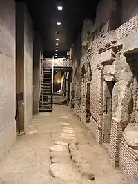 Участок церкви является характерным для Неаполя примером наслоения построек различных эпох. Существующее здание монастыря построено в XIII веке на месте снесённой базилики VI века. Под зданием церкви произведены археологические раскопки, которыми раскрыто около половины рынка римской эпохи, возведённого на месте более древнего греческого (наложение римской цементной кладки на греческую бесцементную отчётливо видно). Доступ в зону раскопок открыт для посетителей в 1992 году, после 25 лет работы археологов.