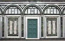 Примечательно, что весь фасад (без треугольного фронтона и боковых скатов), как и в церкви Санта-Мария-Новелла (проект Л. Б. Альберти), точно вписывается в три модульных квадрата: два внизу и третий наверху (реконструкция Р. Виттковера)[3]. В целом композиция нижнего яруса следует традиции аркад, начало которой во Флоренции послужило творчество Филиппо Брунеллески. Верхний ярус включает прямоугольное окно, обрамлённое наличником с двумя колонками, поддерживаемыми мраморными львиными головами, увенчанными тимпаном, в центре которого находится инкрустация в виде вазы между двумя голубями. Над окном расположена мозаика XII века «Христос между Мадонной и Св. Миниато» (1260)[4].
