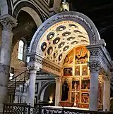 Но самое необычное в интерьере базилики — пресбитерий (1207). Он непосредственно примыкает к апсиде, приподнят на колоннах и образует второй этаж (антресоль) алтарной части, там же находится амвон (кафедра, 1207), или пульпит (лат. pulpitum — помост, подмостки), романского типа и темплон, облицованные мелкими кусочками зелёного, синего, розового, чёрного мрамора в стиле косматеско. Причём средневековые мотивы сочетаются с почерпнутыми из античности: вырезанными из мрамора йониками и бусами. На пресбитерий ведут две боковых лестницы. Третья спускается вниз, в крипту[7][8].