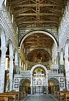 Внутри стены базилики, как и снаружи, облицованы двуцветным мрамором в инкрустационном стиле. Храм не имеет трансепта. Главный неф отделён от боковых аркадами на мраморных колоннах коринфского ордера. Потолок главного нефа, что характерно для романской архитектуры, не подшивной, а с открытыми стропилами, которые ярко расписаны в тосканских традициях растительным орнаментом (XIV в.).
