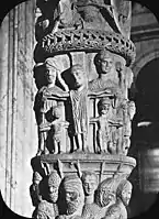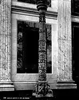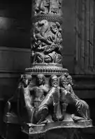 На базе колонны — горельефные изображения женских полуфигур и симметрично-удвоенных (симультанных) миксантропических (смешанных) существ, напоминающих сфинксов: с телом льва и головами (попеременно) человека и барана. В. Г. Власов, опираясь на исследования Дж. Фергюсона, Дж. А. Холла и, в особенности, К. Леви-Стросса о симультанных (симметрично развёрнутых изображениях)[17] интерпретировал повторяющиеся женские фигуры между львами в качестве «вавилонских блудниц»[18].