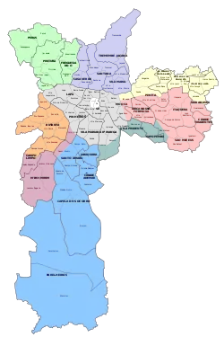 Город Сан-Паулу делится на 31 городской район, называемые субпрефектурами (subprefeituras). Каждая субпрефектура делится на несколько округов (в большинстве случаев, два или три). Субпрефектура с наибольшим числом районов — Се (порт. Subprefeitura da Sé), находящаяся в историческом и деловом центре, который имеет восемь округов. Вместе с административным делением существует и географическое радиальное разделение, установленное в 2007 году мэром Жилберту Кассабом. Город таким образом делится на десять регионов (исторический центр, расширенный центр, север, юг, восток, запад, северо-восток, северо-запад, юго-восток и юго-запад), каждый имеет характерный цвет автобусов и уличных табличек. Это деление не имеет никакого отношения к субпрефектурам и районам, и, в некоторых случаях, один и тот же район может находиться в двух или более географических регионах. Район, где находится руководство субпрефектуры, получает то же название, что и супрефектура, за исключением М’Бой-Мирим.