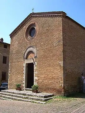 Внутри церковь украшена фресками сиенской школы начала XIV века. Среди них: