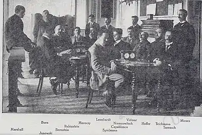 | 4 | Фрэнк Маршалл | ½ | 1 | ½ | ½ | ½ | ½ | ½ | ½ | 1 | ½ | 1 | ½ | 0 | 1 | 4 | 1 | 9 | 8½ | 4 | |||