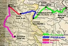 Новая династия была более националистична и более дружелюбно относилась к России, нежели к Австро-Венгрии[12]. В течение последующих десятилетий споры Сербии с соседями вспыхнули с новой силой, поскольку Сербия пыталась восстановить своё величие. Небольшие конфликты позже переросли в таможенный спор с Австро-Венгрией в 1906 году (известный как «Свиная война»)[13]; Боснийский кризис 1908—1909 годов, в котором Сербия протестовала против аннексии Боснии и Герцеговины Австро-Венгрией[14]; и, в конце концов, в две Балканские войны в 1912—1913 годах, в ходе которых с Македонии и Косова было снято Османское владычество и предотвращено возвышение бывше-союзнической Болгарии[15].