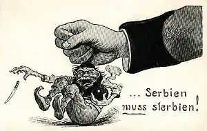 В течение нескольких часов после убийства в Сараеве вспыхнули антисербские погромы, которые были остановлены военными[87]. В ночь убийства были организованы погромы и в других частях Австро-Венгрии, в частности на территориях современных Боснии и Герцеговины и Хорватии[88][89][90]. Считается, что они были организованы и поддерживались Оскаром Потиореком, австро-венгерским губернатором Боснии и Герцеговины[91]. Первые антисербские демонстрации, во главе с последователями Йосипа Франка, были организованы 28 июня в Загребе. На следующий день демонстрация стала более жестокой и переросла в погромы. Полиция и местные власти не предпринимали никаких действий, чтобы остановить насилие против сербов[92]. Писатель Иво Андрич назвал акцию в Сараеве «Сараевским безумием ненависти»[93]. Два серба были убиты в первый день погрома в Сараеве, многие подверглись нападению и были ранены; около тысячи домов, школ, магазинов и других заведений, принадлежавших сербам, были разграблены и разрушены[94].