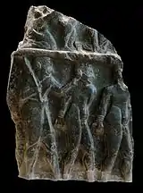 - Победная стела аккадского царя из Суз — также открыта французской экспедицией под руководством Ж. де Моргана. Сохранилась в двух фрагментах, ныне хранящихся в Лувре (Louvre, Sb 2 и Sb 3). Композиция фрагмента Sb 2 близка к изображению на «Стеле коршунов» шумерского правителя Эаннатума: главный герой держит сеть, опутывающую врагов и заносит булаву над головой одного из пленников. Справа от сети изображена фигура божества. На фрагменте Sb 3 изображены вереницы пленных. Стела сильно повреждена, от фигуры царя сохранились лишь изображения рук и части бедра; он облачен в бахромчатую одежду, вероятно каунакес. Высказывались предположения, что стела отражает триумф Саргона над конфедерацией шумерских номов, а косматый пленник, над головой которого занесена булава царя — Лугальзагеси.