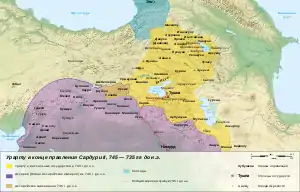 В 744 году до н. э. в соседней с Урарту Ассирией произошли политические перемены. Относительно мирных правителей Ашшур-дана III (период правления 772—755 гг. до н. э.) и Ашшур-нирари V (период правления 754—745 гг. до н. э.) сменил решительный Тиглатпаласар III, который немедленно начал борьбу за восстановление Ассирией былого господства в Передней Азии. Тиглатпаласар III провел ряд реформ в ассирийской армии и начал успешные боевые действия на западных границах Урарту, направленные на возврат Ассирии контроля над торговыми путями в Малую Азию, отобранные урартами при царе Менуа. К 735 году до н. э. состоялось решающее сражение между ассирийской армией и урартской армией на западном берегу Евфрата. Ассирийцы разбили урартскую армию и захватили большое число пленных и различные трофеи. Сардури II, который командовал урартской армией, бежал с поля битвы в столицу Урарту Тушпу, а Тиглатпаласар III продолжил военный поход вглубь Урарту. Ассирийская летопись сообщает: