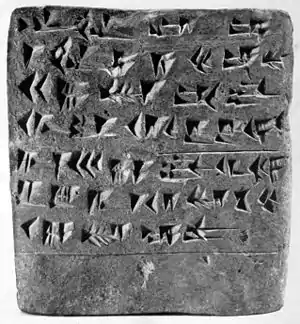 Слева: Царский приказ о переделе земель. Снизу таблички видны следы цилиндрической печати, удостоверявшей подлинность документа. |