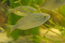 Тело почти овальное, сжатое с боков, умеренно высокое, покрыто мелкой чешуей. Глаза маленькие, их диаметр меньше длины рыла. Рот маленький. Зубы на обеих челюстях резцевидные, расположены в один ряд. Режущий край передних зубов верхней челюсти с одной заметной зазубренной (выемкой) посередине, которая разделяет его как бы на два зубчика. На нижней челюсти зубы с заострённой вершиной треугольной формы. Спина серовато-голубая, бока и брюхо беловато-серебристые. На боках имеется до 10—11 оранжевых или золотисто-оранжевых продольных полос, некоторые из них переходят на голову. У основания грудных плавников имеется нечеткое тёмное пятно[2][8].