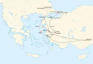 Всю землю, сколько ее находилось в Азии под властью римлян, турки по общему согласию и жребию разделили между собою. Карман Алисурий [Гермиян Алишир] получил большую часть Фригии, также земли, простирающиеся от самой Антиохии, находящейся при реке Меандре, до Филадельфии и соседних с нею мест. Другой турок, по имени Сархан, получил земли, простирающиеся оттуда до Смирны и приморских мест в Ионии.
