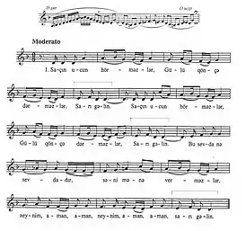 ![]() Нотная запись песни «Сары гялин» | |