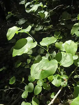 Лиана с вытянутым в длину стебель 15—20 м и диаметром у основания 1—2 см. Снизу стебли без волосков, без листьев. На всём протяжении усажен твёрдыми, прямыми, изогнутыми кончиками — шипами 4—10 мм длиной. В средней и верхней частях к шипам присоединяются листья — очередные, цельнокрайные; яйцевидной, округлой или треугольной формы. Листья сидят на коротких черешках, а выше основания черешка расположена пара усиков, которыми растение и прикрепляется к опоре. Чем ближе к верхушке, тем более гибким становится стебель.