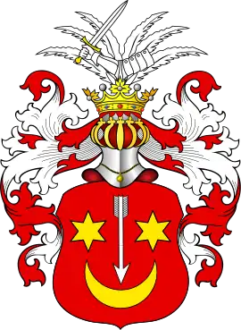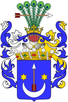 В красном поле(Сас II), в голубом поле(Сас I) серебряный полумесяц, рогами обращённый вверх и имеющий на концах по золотой шестиугольной звезде, а из средины его летит вверх стрела. Над шлемом семь павлиньих перьев — павлиний хвост, пробитый стрелой вправо.