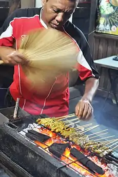 Для раздувания углей любого вида в мангале традиционно используются веера из плотной бумаги или бамбуковой щепы, а также небольшие циновки. В современных условиях для этой цели часто применяются электрические вентиляторы. Различные виды сате требуют большего или меньшего жара углей. Абсолютное большинство их принято начинать жарить, когда угли уже перестают давать языки пламени, и лишь некоторые — как, например, уже упоминавшийся выше бараний сате-клатак — готовятся на небольшом открытом огне[27][32].