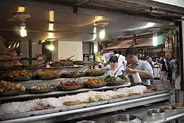 Не меньшим спросом это кушанье пользуется в заведениях общественного питания всех уровней — от деревенских харчевен, размещающихся под матерчатыми навесами, до столичных ресторанов самого высокого класса. В городах и деревнях юго-западных Филиппин едва ли не основным видом заведений общественного питания являются сатти-хаусы (англ. satti house), основное меню которых составляют мини-шашлычки с традиционным гарниром[70][71]. В Малайзии и Индонезии же существуют не только многочисленные отдельные рестораны, но и достаточно разветвлённые ресторанные сети, специализирующиеся исключительно на сате: например, Sate Kajang Haji Samuri в первой из этих стран и Sate Khas Senayan во второй[89][90]. Сате является весьма популярным банкетным и фуршетным блюдом, а также одной из наиболее распространённых составляющих рийстафеля — комплексного обеда наподобие шведского стола, введённого в обиход голландцами в период их владычества в Индонезии, а затем вошедшего в нидерландскую и, в значительно меньшей степени, в индонезийскую ресторанную практику[91][92]. Кроме того, миниатюрные шашлычки нередко включаются в меню бортового питания на рейсах авиакомпаний тех стран, где популярно это блюдо[93][94].