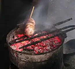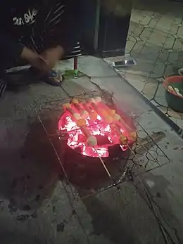 В качестве топлива для жарки сате традиционно используется древесный уголь, который может выжигаться непосредственно в мангале, однако чаще засыпается туда уже в готовом виде: угли для сате являются исключительно ходовым товаром во всех местностях, где популярно это кушанье. В разных регионах для изготовления углей может использоваться древесина различных пород деревьев: к числу тех, угли которых дают наибольший жар при наименьшем дыме, специалисты относят такие виды, как Myristica cinnamomea, Castanopsis acuminatissima, Lithocarpus ewyckii, Syzygium polyanthum, Ficus nervosa[29][30][31]. Большим спросом также пользуются угли из скорлупы кокосовых орехов: их преимуществом считаются более продолжительное горение с меньшим количеством пепла и дыма. Кроме того, иногда для приготовления сате используются каменноугольные брикеты, однако расширению такой практики препятствует не только их относительная дороговизна, но и опасения некоторых потребителей, что каменноугольная пыль может негативно сказаться на вкусе блюда[25][32].