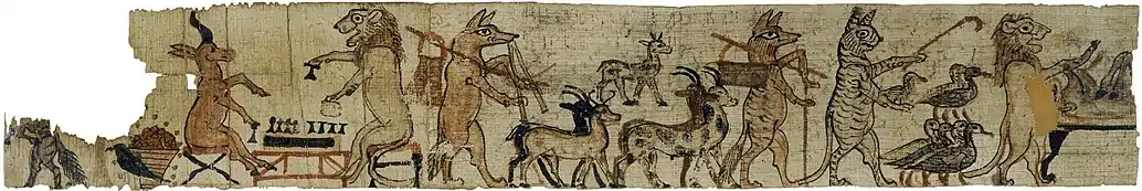 Ранним примером сатиры можно назвать древнеегипетское литературное произведение «Сатира на профессии»[3] эпохи Среднего царства (XX—XVIII века до н. э.)[4]. Из-за сатирического описания разных профессий занятие писца выставлено более достойным[3]. В сатирическом папирусе эпохи Рамессидов (ок. 1150 год до н. э.) изображённые животные в нетипичных для себя сценах могут обозначать пословицы или рассказы, утраченные сегодня, но понятные древнему египтянину, либо содержат политическую или религиозную сатиру[5]. Подобные изображения животных встречаются также на остраконах, сосудах, косметических принадлежностях и фигурках Нового царства.