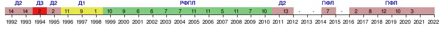 | 1996 | Первая лига/ Первый дивизион (2) | 11 из 22 | 42 | 16 | 9 | 17 | 48-48 | 57 | 1/16 | ЦСКА (д) — 0:2 | ||