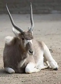 | Антилопа аддакс, обитающая в удалённых районах Сахары, находится под угрозой вымирания | Миниатюрная лисица фенек — обычный обитатель Сахары | Газель-доркас, находится под угрозой вымирания вследствие сокращения ареала и неконтролируемого отстрела |