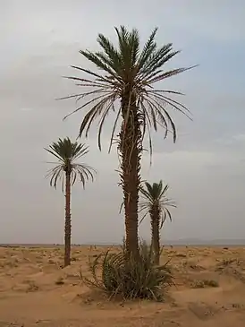 В горных районах пустыни встречается реликтовая неогеновая флора, родственная средиземноморской, много эндемиков. Среди реликтовых древесных растений, произрастающих в горных районах — некоторые виды олив, кипариса и мастиковое дерево. Также представлены виды акации, тамарисков и полыни, дум-пальма, олеандр, финик пальчатый, тимьян, эфедра. В оазисах возделывают финики, инжир, оливковые и фруктовые деревья, некоторые цитрусовые, различные овощи. Травяные растения, произрастающие во многих частях пустыни, представлены родами триостница, полевичка и просо; на побережье Атлантического океана растёт прибрежница и другие солестойкие травы. Различные комбинации эфемеров образуют сезонные пастбища, называемые ашебами. В водоёмах встречаются водоросли[2][5].