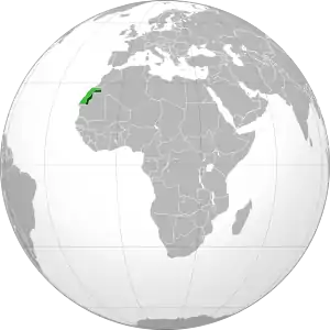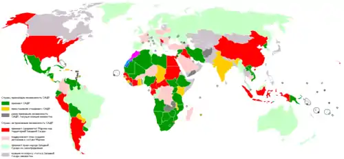 ![]() Сахарская Арабская Демократическая Республика на карте мира. Светло-зелёным обозначена спорная территория Западной Сахары |