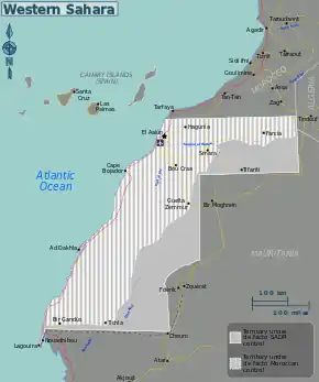 | Бо́льшая часть территории САДР в настоящее время контролируется Марокко; фактически территорией САДР является Свободная зона. | |||||