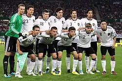 | Прозвища | Die Mannschaft (Команда), Nationalelf (Национальные одиннадцать), Adler (Орлы), Bundesteam (Бундестим), Deutsche Maschine (Немецкая машина) | |||||||||||||||||||||||||||||||||||||||||||||||||||||||||||||||||||||||||||||||||