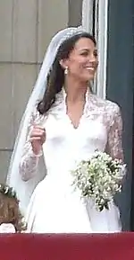 Свадебное платье от лондонского дизайнера Сары Бёртон из дома моды Alexander McQueen[78] было сшито из атласа и состояло из кружевного лифа и юбки. Кружевной лиф ручной работы из шёлкового тюля цвета слоновой кости был создан с использованием техники, возникшей в Ирландии в 1820-е годы (узор на основе собирается из отдельных цветочных мотивов, вырезанных из кружева)[79]. Эти кружева были сделаны в Королевской школе рукоделия в Хэмптон-корте[80]. Вуаль удерживалась тиарой от Cartier, изготовленной в 1936 году и одолженной невесте королевой. Она была приобретена отцом королевы, герцогом Йоркским (впоследствии ставшим королём Георгом VI) для его герцогини (позже королевы Елизаветы и королевы-матери) за три недели до наследования им трона от его брата Эдуарда VIII, герцога Виндзорского. Принцесса Елизавета (впоследствии королева) получила тиару от матери на 18-летие[81].