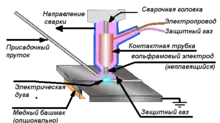 При сварке неплавящимся электродом в атмосфере защитного газа электрическая дуга зажигается между вольфрамовым электродом и свариваемыми материалами основания, либо сварочной ванной. Возникающее тепло расплавляет кромки свариваемых деталей материала основания и вместе с ними — присадочный материал.
