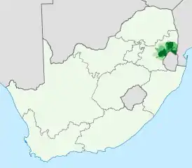 ![]() Распространение свати в ЮАР, доля населения, говорящего на свати дома: 0–20% 20–40% 40–60% 60–80% 80–100% | |